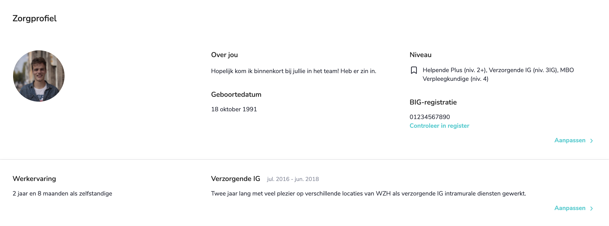 Als jij je voor een dienst aanmeldt dan krijgt de opdrachtgever een korte versie van jouw profiel te zien. Je kunt je voorstellen dat een zorgprofessional die zichzelf netjes voorstelt in dit profiel, sneller wordt aangenomen dan iemand die nauwelijks wat heeft ingevuld.