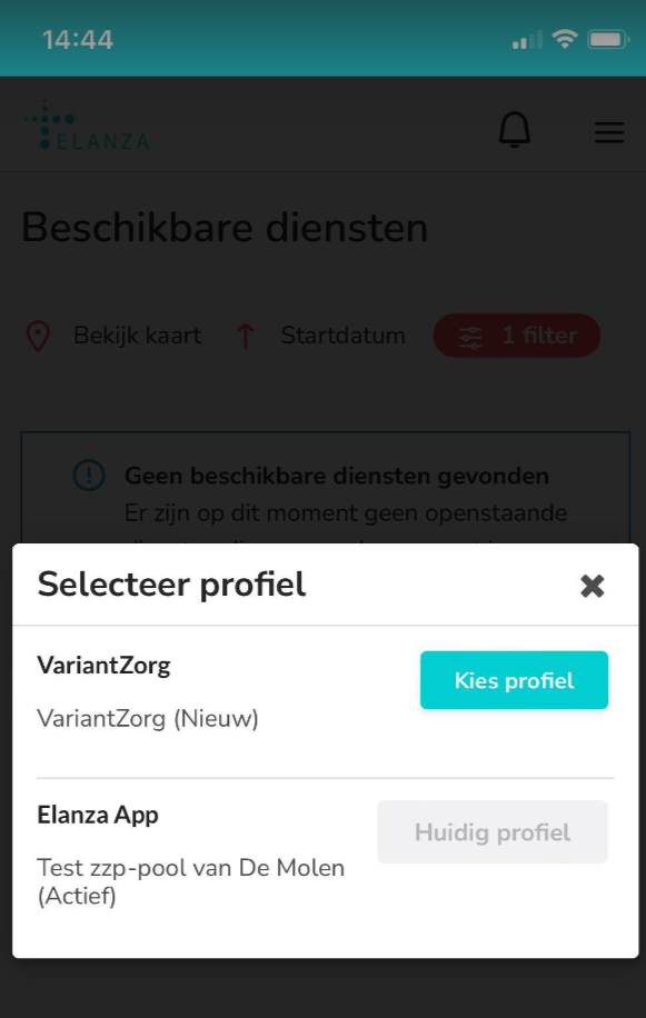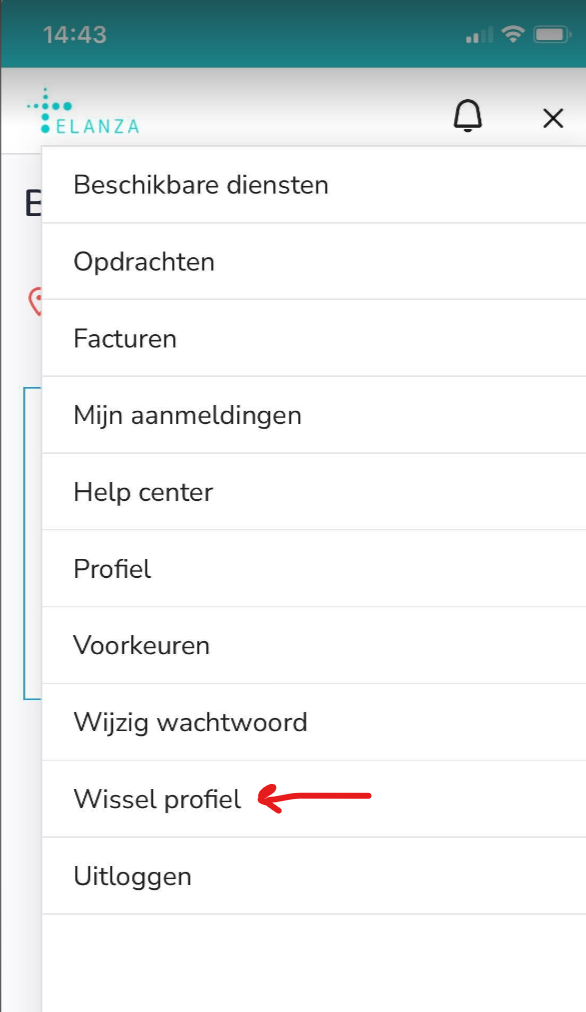 Als je voor meerdere organisaties werkt kun je wisselen van organisatie door op 'Wissel profiel' te klikken.