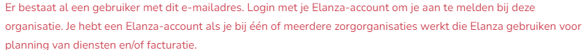 Het is mogelijk dat je al bij een organisatie werkt of hebt gewerkt die gebruikmaakt van hetzelfde Elanza-platform. Wanneer je probeert een account aan te maken bij een nieuwe organisatie en de volgende melding ontvangt, betekent dit dat je al over een Elanza-account beschikt: